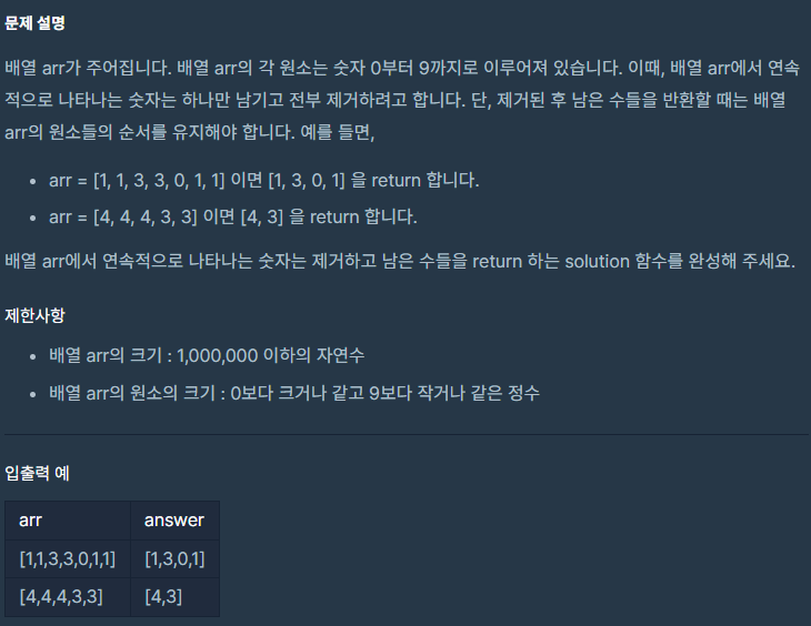 Programmers [Programmers] 같은 숫자는 싫어 문제 - (javascript) - 728x90 문제 이름 : 같은 숫자는 싫어 <<< 문제 내용 >>> function solution(arr) { return arr.filter((_, i) => arr[i] !== arr[i+1]); } 도움이 되셨다면 공감 부탁드립니다. 공유하기 게시글 관리 MoveRoad's Factory 저작자표시 (새창열림) 'Programmers' 카테고리의 다른 글 [Programmers] 최고의 조합 문제 - (javascript) (0) 2022.04.21 [Programmers] 피로도 문제 - (javascript) (0) 2022.04.21 [Programmers] 네트워크 문제 - (javascript) (0) 2022.02.14 [Programmers] 소수 만들기 문제 - (javascript) (0) 2022.02.13 [Programmers] 소수 찾기 문제 - (javascript) (0) 2022.02.12 Contents 당신이 좋아할만한 콘텐츠 [Programmers] 최고의 조합 문제 - (javascript) 2022.04.21 [Programmers] 피로도 문제 - (javascript) 2022.04.21 [Programmers] 네트워크 문제 - (javascript) 2022.02.14 [Programmers] 소수 만들기 문제 - (javascript) 2022.02.13 댓글 0 + 이전 댓글 더보기