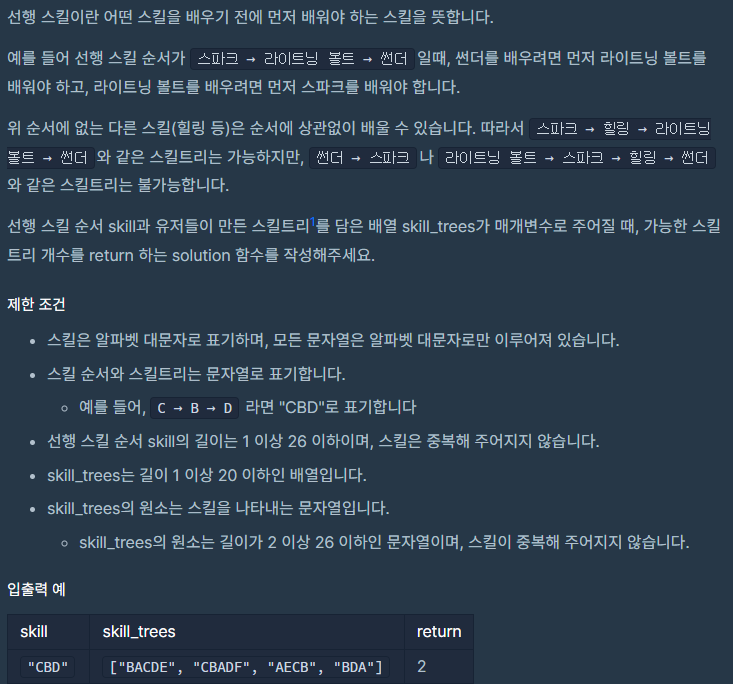 * 처음 문제를 보고 백트래킹으로 풀수있을거 같다는 생각에 시도하였다가 skill이 C,B만있을때도 가능해야 한다는 것을 간과했다.