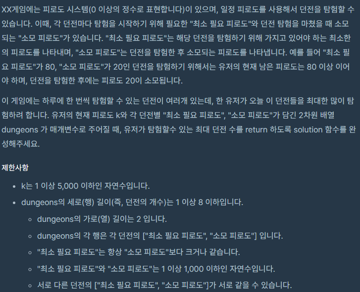 ( 필자는 그리디, 냅색, 정렬 셋 중의 하나 문제라고 생각하고 고민을 오래하다가 dungeons의 길이가 1-8인 것을 보고 순열, 조합도 가능하겠다 싶었다. 제한사항도 나름의 힌트가 된다.)