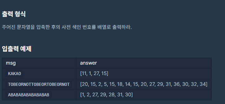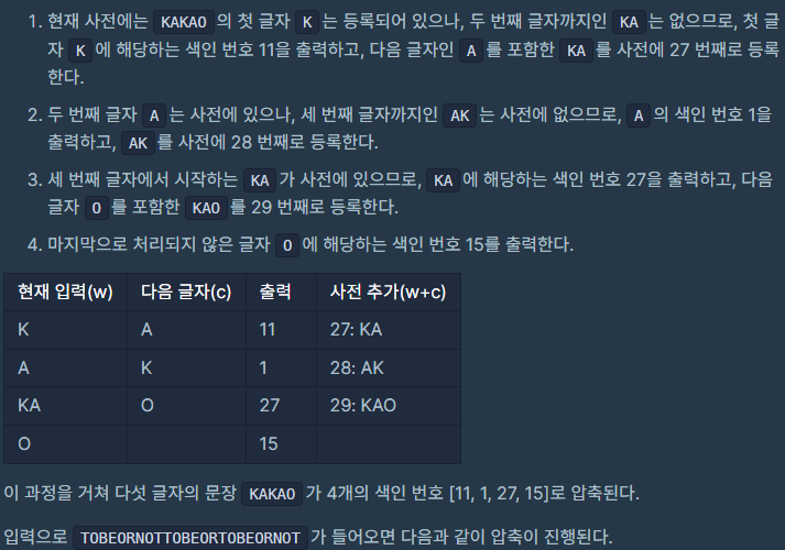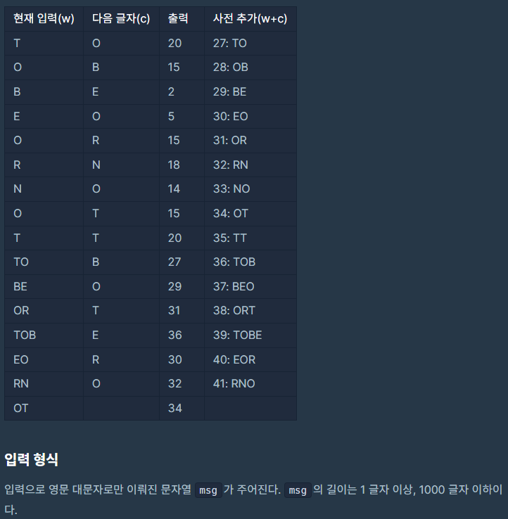 이때, 그 문자가 사전에 없을때 이전 문자 기준으로 사전에 등록된 번호를 받아야하기 때문에 문자를 붙이기 전 x에 잠시 담아줍니다.