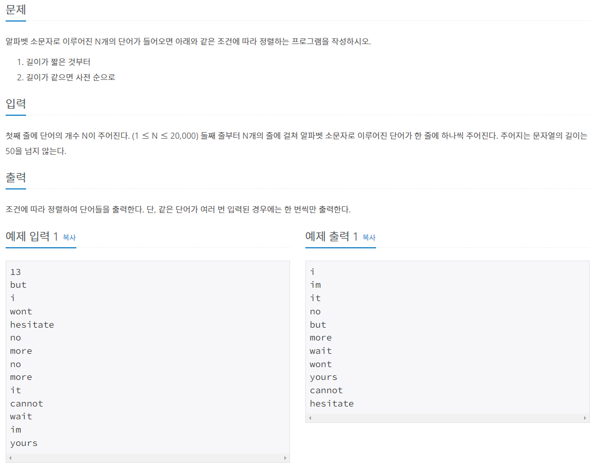 문제 바로가기 ☞ https://www.acmicpc.net/problem/1181