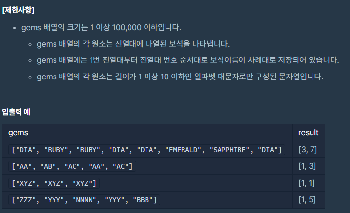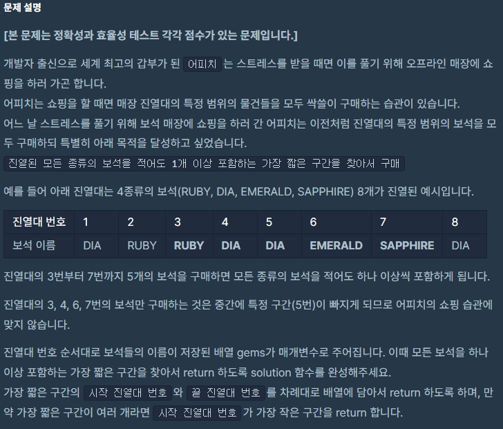 * 레벨 3 다웠다.. 처음 문제를 보고 투포인터로 보석 갯수만큼 찾으면,