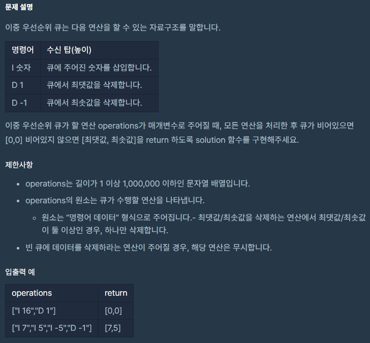 * 최소힙과 최대힙을 이용해 문제를 해결했다. 테스트 케이스가 굉장히 부실해서 그냥 queue를 이용해서 shift, pop만으로도 해결가능하다고 한다. 지금 위 코드도 테스트케이스가 부실해서 가능할 수도 있는 코드다.