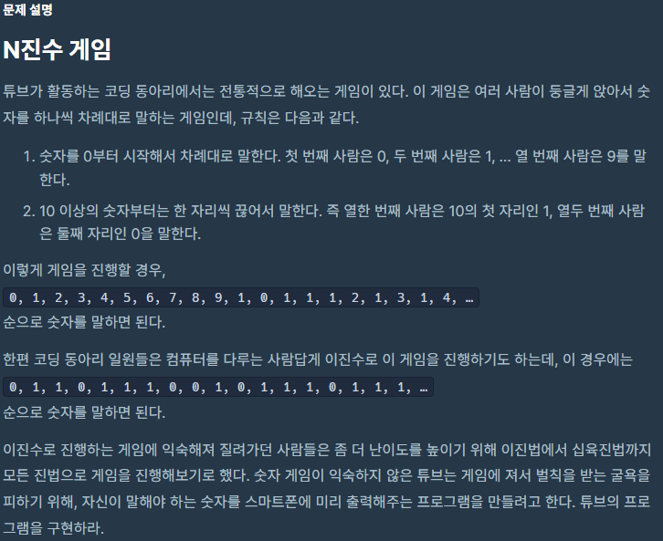 Programmers [Programmers] [3차] n진수 게임문제 - (javascript) - 728x90 문제 이름 : [3차] n진수 게임 <<< 문제 내용 >>> function solution(n, t, m, p) { let answer = ''; let str = ''; let num = 0; while(str.length<t*m){ str+= num.toString(n).toUpperCase(); num++; } for(let i=p-1; i<t*m; i+= m){ answer += str[i]; } return answer; } * 레벨 2 치고는 쉬운 편이었다. 숫자를 2진수로 바꿔가면서 사람(m)이 2명이고 내 차례(t)가 4번일 때, 결국 m*t인 8개까지만 구하면 그 이후는 순서에 맞게 출력만 하면 된다. 도움이 되셨다면 공감 부탁드립니다. 공유하기 게시글 관리 MoveRoad's Factory 저작자표시 (새창열림) 'Programmers' 카테고리의 다른 글 [Programmers] 보석 쇼핑 문제 - (javascript) (0) 2022.02.03 [Programmers] 경주로 건설 문제 - (javascript) (0) 2022.02.01 [Programmers] [3차] 파일명 정렬 문제 - (javascript) (0) 2022.02.01 [Programmers] [3차] 방금그곡 문제 - (javascript) (0) 2022.02.01 [Programmers] k진수에서 소수 개수 구하기 문제 - (javascript) (0) 2022.01.31 Contents 당신이 좋아할만한 콘텐츠 [Programmers] 보석 쇼핑 문제 - (javascript) 2022.02.03 [Programmers] 경주로 건설 문제 - (javascript) 2022.02.01 [Programmers] [3차] 파일명 정렬 문제 - (javascript) 2022.02.01 [Programmers] [3차] 방금그곡 문제 - (javascript) 2022.02.01 댓글 0 + 이전 댓글 더보기